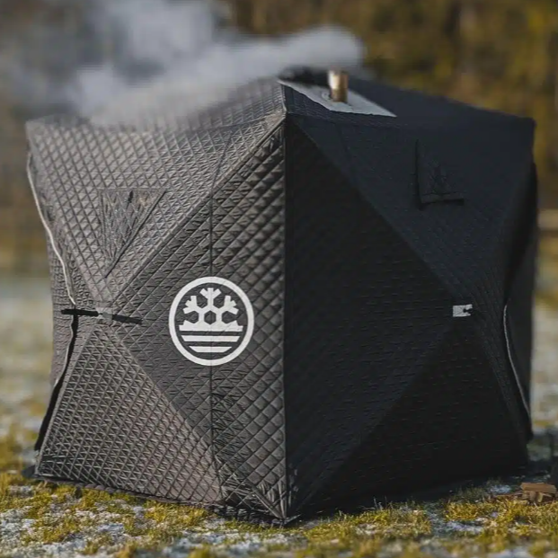 Portable, heavy-duty sauna tent with panoramic windows and wood-burning stove — for authentic sauna rituals anywhere outdoors.